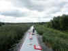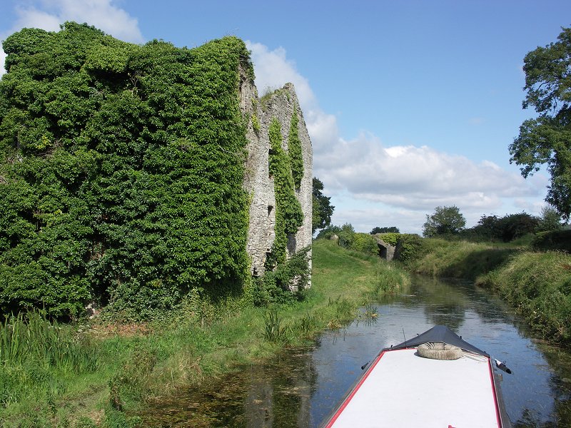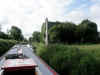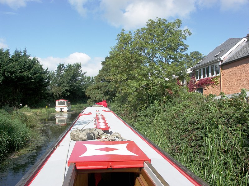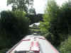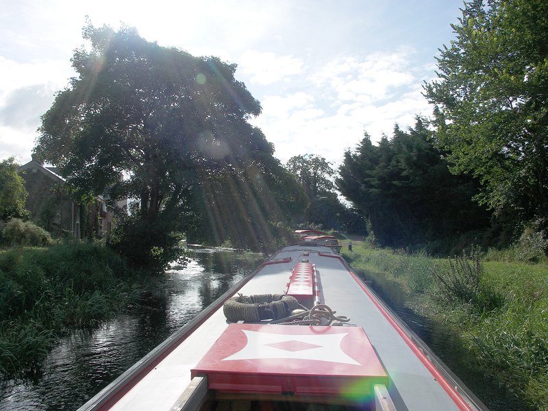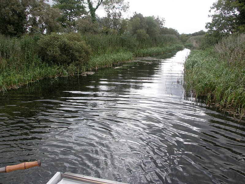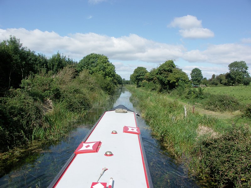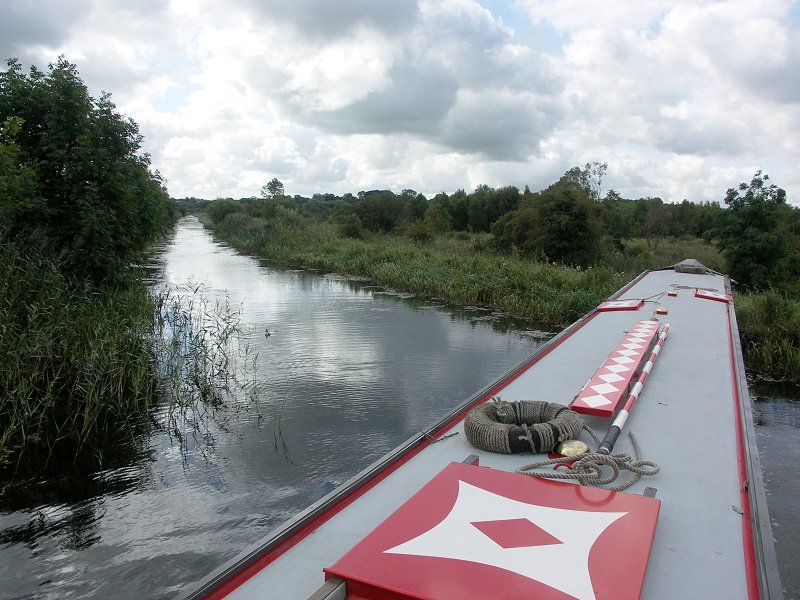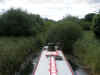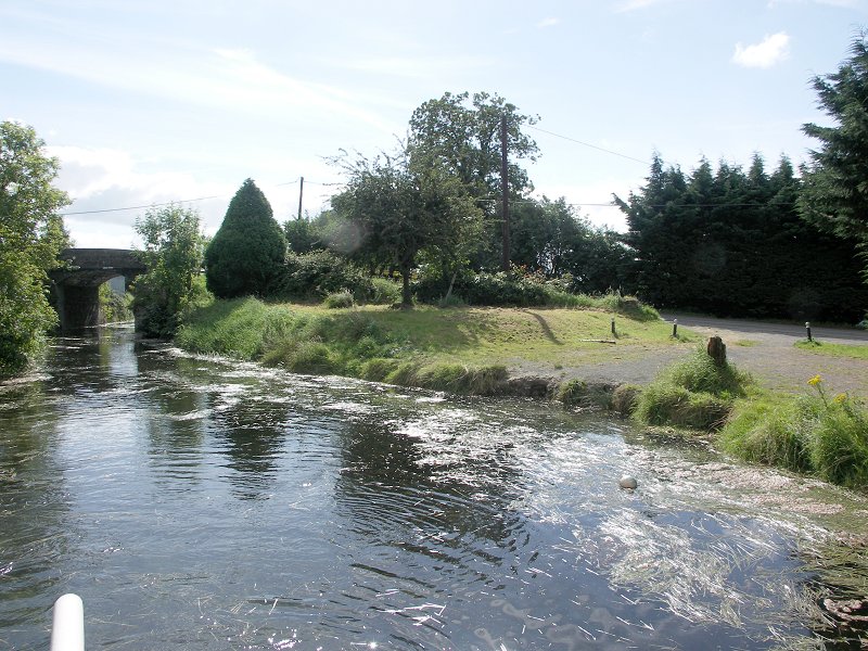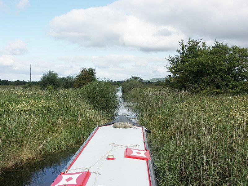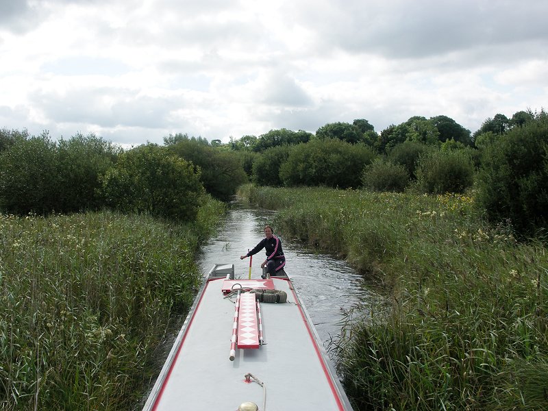 two enlarged feeder arms into the fen, was blocked by a fallen tree, a few hundred feet up. This arm goes to the main Seven Springs area. Being relatively weed and free of overhanging bushes we reversed easily up the west arm. Soon we passed the tight turn off to the Father Moore's Well springs, the embanked "towpath" carried on round this course. We carried straight on until we were as good as at the end, by some houses and the road through Pollardstown. So at 11:00 we took our pictures, then headed back down the feeder, exiting at 13:45, a somewhat faster return passage. From here we proceeded down the old Lock No 19, then turned right up the New Barrow Line to Lowtown, where we headed down the Shannon Line. We stopped for the night on a nice deep mooring on the Blundell / Edenderry Embankment at 17:35. It must have been a good spot, for a local boater arrived not long after!