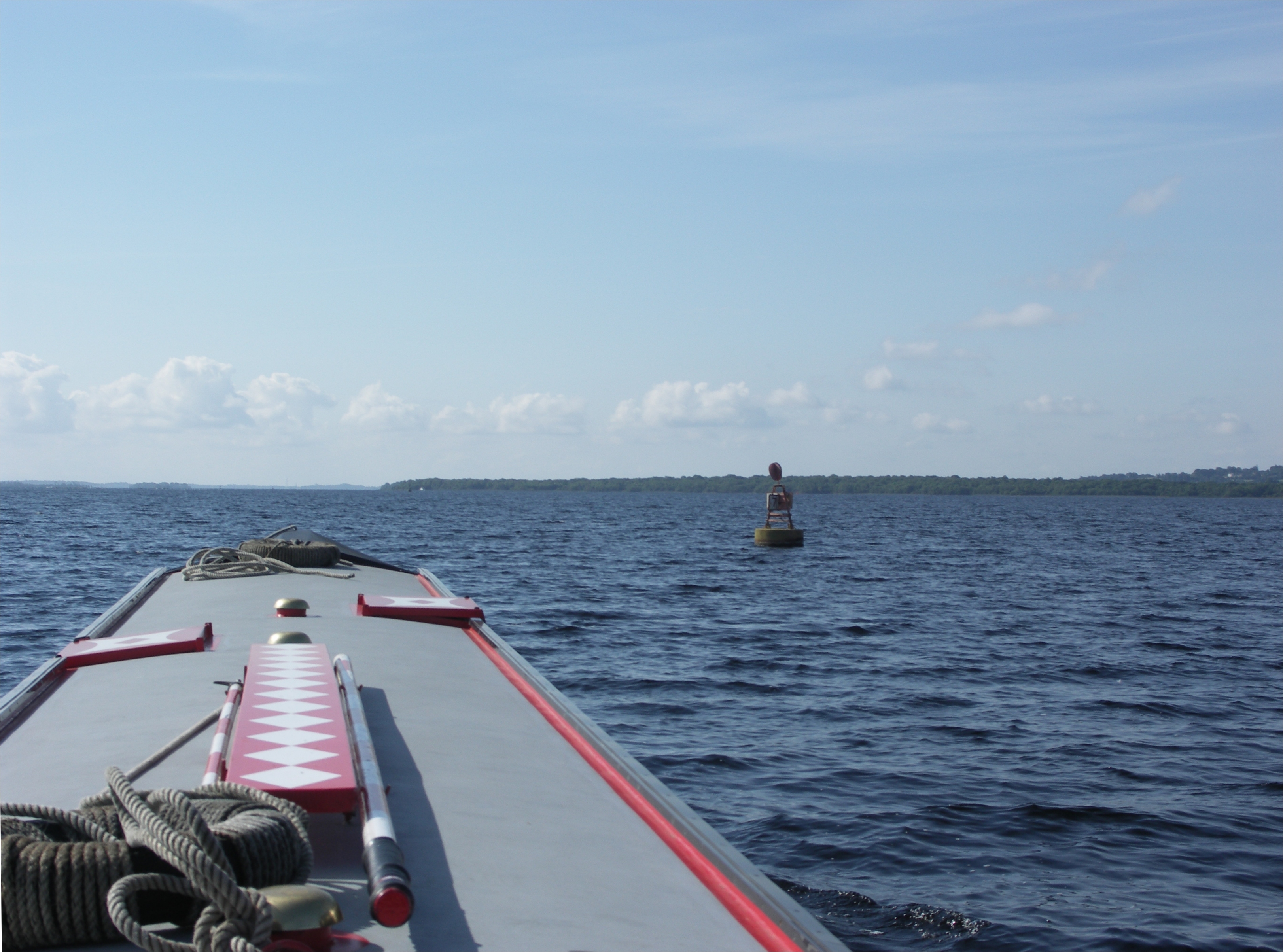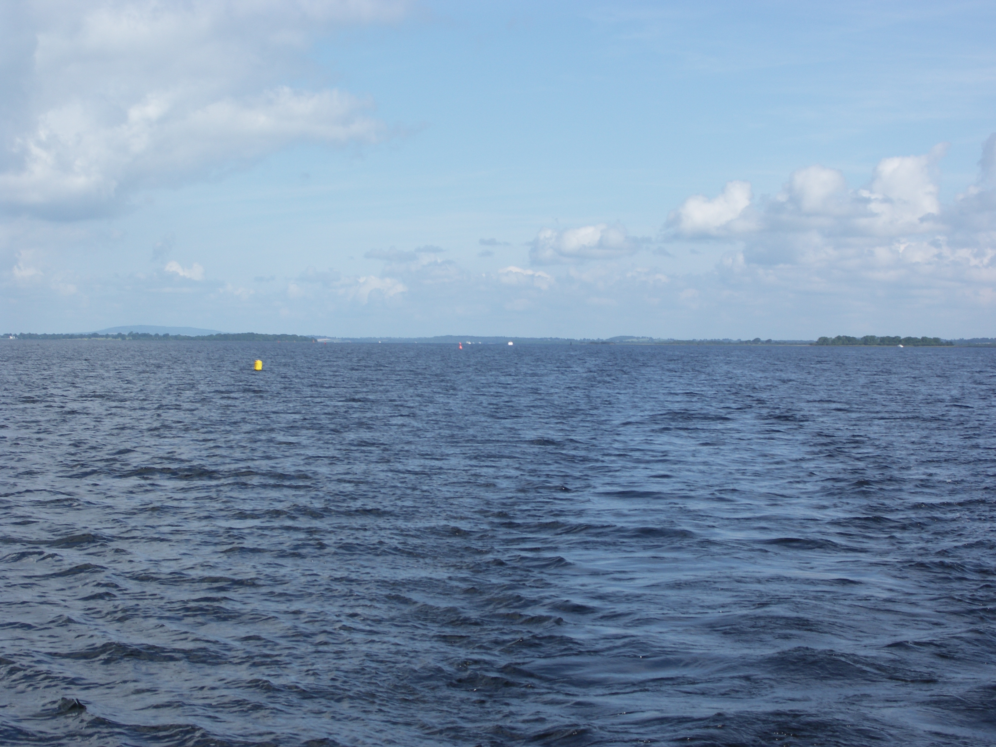 Looking back at a yellow racing buoy and big red buoy No 1. Lough Ree.