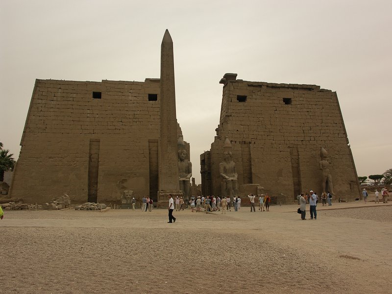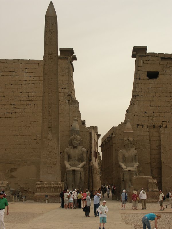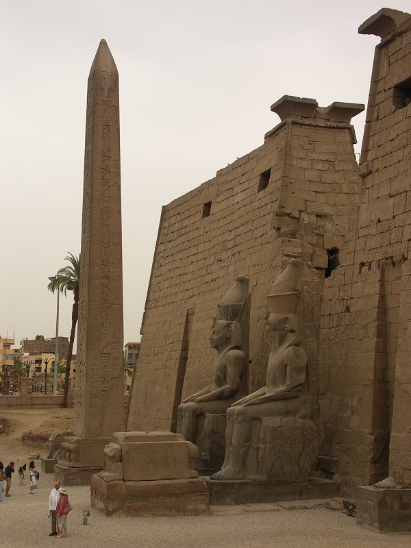 Luxor Temple entrance pylons, statues of Ramesses II and one of the obelisk's.