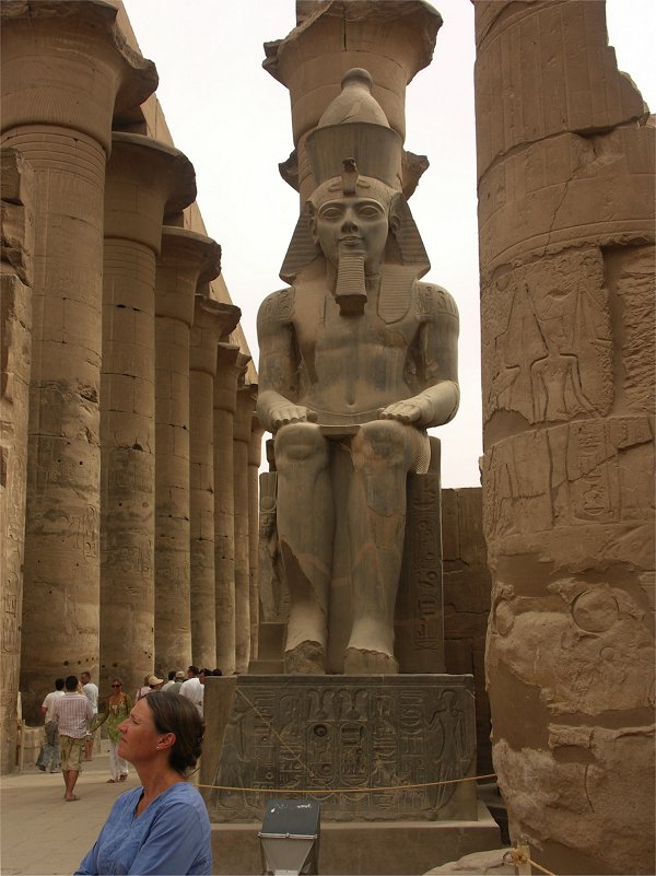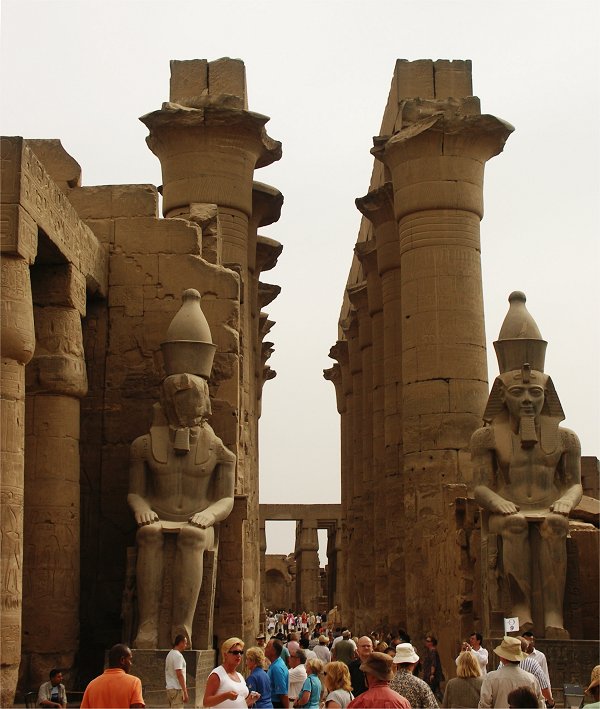 The forecourt of Nectanebo. Luxor Temple entrance pylons, statues of Ramesses II