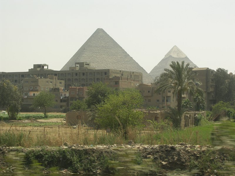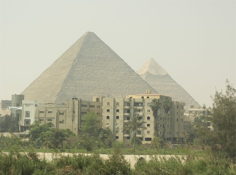 The pyramids of Khufu and Khafre from Giza town.