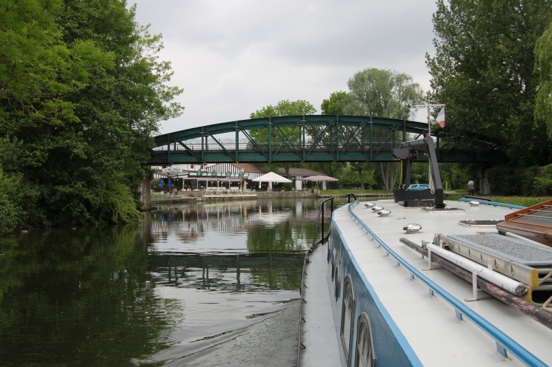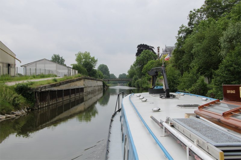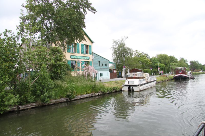 10:00 departure from Corbie, Sommelier turned up at the lock, 15mins after our fone call. 12:05 to 14:05, lunch "hour" above Lamotte Lock No16. Nice location, made contact with the two Brit ladies on Locaboat. They were not enjoying the boating aspect of their first boating holiday and failed to grasp any boating techniques from their brief instruction from Locaboat. We stopped on the "University" moorings below Amiens Lock No17 at 16:15. The wharf at St Leu, above the backwaters through the town had one spare spot, but we saved that for the Locaboat ladies, as they "had" to get to a shoreline outlet for a charge up. Drizzly evening, we eventually wandered up to The St Leu waterside restaurant area.