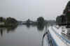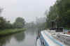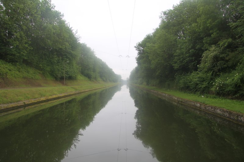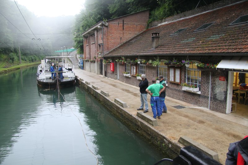 The VNF lads turned up around 07:15 and we soon became aware we were to be the only tow! They dispensed with the long X ropes we had prepared, instead they had a longish single rope suspended between another rope between the massive towing bollards. The loop at the other end of their rope was set to freely move on one of our ropes, set between out front bits. After a very brief safety talk, VHF on channel 10, we "should" (and did) wear life jackets, lay down VHF aerial (bit near the 600vDC trolley wires!), Turn engine on for emergency stop, turn engine on as soon as we exit tunnel so we could immediately detach and pass them under power, we set off at 07:30. Magical experience. The tow soon settled down with the tug slipping along the towpath and Final Fling settling down to being just off the towpath. Dabs of bowthruster was occasionally needed to keep away from the un-fendered tunnel wall. Many sections was cut through solid chalk, with some buttressing and vaulting, to hold up roof. For most of the passage the VNF bods were below, probably having their petit dejeurner. Yet again the tunnel was reasonably well lit by fluorescent lamps and very dry. About half way through the air got very misty, and stayed that way until we exited the 5670m tunnel at 09:05. The wires continued for some distance, as the tug had to pull up to 30 Peniches! Once round the corner we noticed the wires were getting rather low! and had to pull over to towpath side and pick out way under the support guys. Peter used the plastic end on the boat hook, and wore his gloves, just in case! It looked like a guy cable had snapped on the far bank. There was a lot of VNF activity at Bosquet top lock, we gathered that something had got stuck under the top cill of the automatic lock and they had just cleared it. A friendly VNF bod gave us a Telecomander (zapper) as the locks are automatic, but not radar detected down this side of the St Quentin Canal. The zapper locks all worked well and we positively flew down the other side of the St Quentin, with yet again NO traffic going our way. We passed one Peniche and one French pleasure barge going the other way. There was a VNF bod in the (new) cabin at Lock No9 Crèvecoeur and he popped out to ask where we were going that night and where headed after that. We were given duff info about where to moor in Cambrai, so went past the Port de Plaisance basin above Cantimpre Lock (the first lock on the Escaut Canal) and after a traverse of the next basin, we moored up just before the entrance to this basin (15:30) We had a wander about and spotted the Murrells barge "Friesland" in the Port de Plaisance. We subsequently found that what was the visitor mooring side was completely free. That night it was a good and reasonably priced set meal in the Grandmere Bistro, not far along the road to the centre of town.