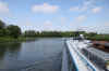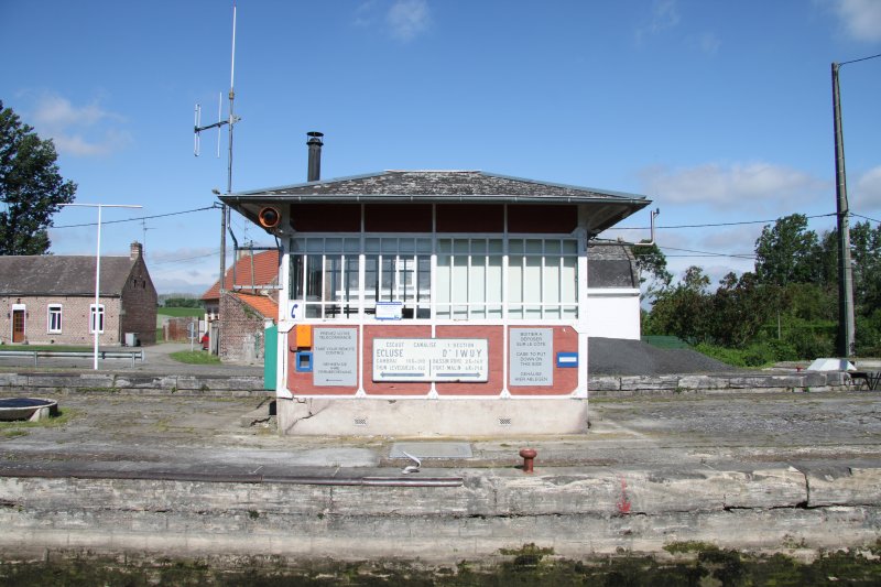 08:35 departure from Cambrai, now on the Escaut Canalisee. 10:30 saw us stuck above the entrance lock onto the Escaut Canalisee, two reds was not good. We soon found the cabin Interfone and got VNF, a VNF van appeared after only 5 minutes. The VNF bod relieved us of our Telecomander and locked us through. Interesting to note, that if the lock was working, you could use the Interfone to tell of your presence, then VNF could, by remote control drop a Telecomander through a vending machine type hole. There was also another hole to drop off your Telecomander. 11:20 saw us turn left out onto the mighty Dunkerque - Escaut - Waterway, the up-rated Canal de la Sensee. We declined to exit by the backwater at Pont Malin, as there was a sign claiming only 0.9m depth. The Sensée was surprisingly quiet, not much coming the other way and nothing caught up with us, until we past the entrance to the Nord (13:15), where we left the Sensee a week of so before. At 15:15 we swung off the Sensee and headed up to the first lock on the Scarpe Supérieure. Next followed a "comedy" hour as we attempted to get a zapper for the Scarpe Supérieure. There was no one about and no instructions at the new cabin by the first lock (Corbehem). A friendly Belgian Spitz captain told us that we should go up, round the corner on the Sensée to the Corchelettes Lock and get a telecomander from the locky. This we did, Peter got a trip up the stairs to the lock control cabin, where the locky, showed him an empty box! He soon foned up a VNF bod, who said he would meet us at Corbehem Lock, with a zapper. After we arrived, it was only 5 minutes wait until he arrived. Fortunately had to do some paper work in the cabin, when Peter was still in "assent" mode and pushed the wrong button on the Telecomander. The bemused VNF bod assumed control, re-set the lock and locked us through. Boy are the Scarpe Supérieure locks slow, in fact so slow there was no need to bother with ropes. Interesting bit of industry above Corbehem, the large paper works was being rationalised and quite a bit being pulled down. The only commercial traffic on the Scarpe Supérieure, was China clay, to just above Corbehem lock. After ploughing on we managed to get out in the open countryside, just beyond Vitry En Artois. It was a hot humid evening, overcast with some spots of rain.