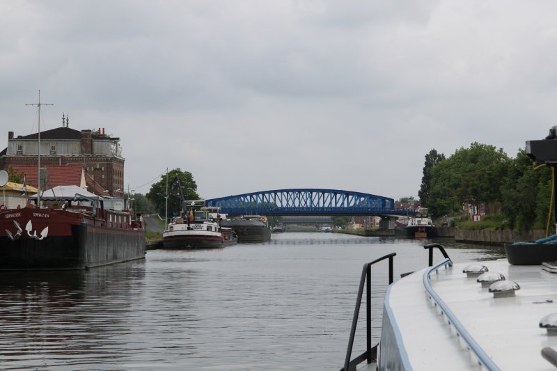 The entrance to the Scarpe Moyenne / barge Garage, is just before the bridge, on