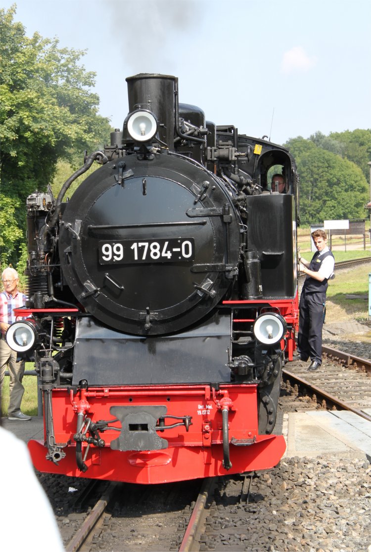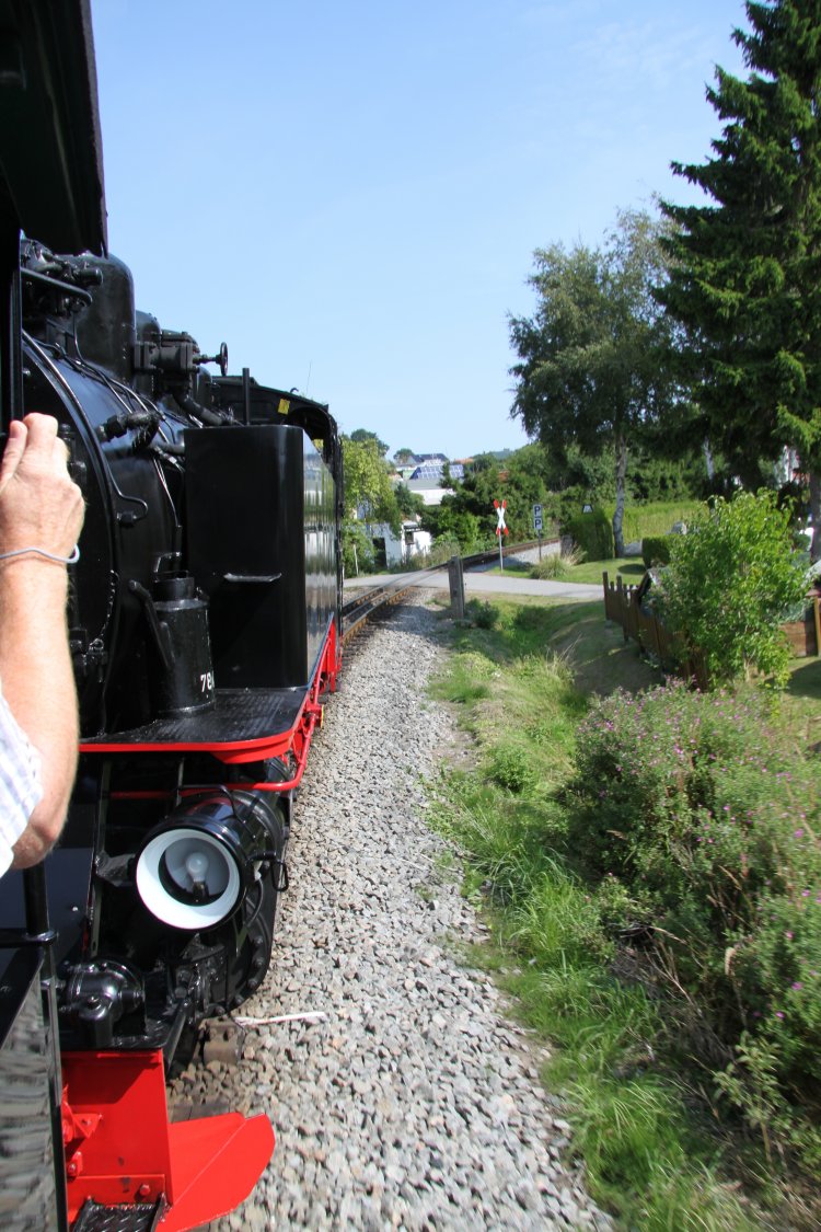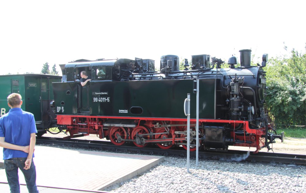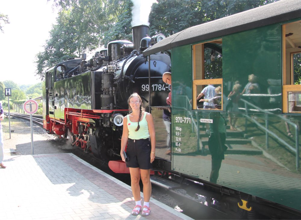 Linda poses in front of the train at Binz Station. Rasender Roland "Rushing