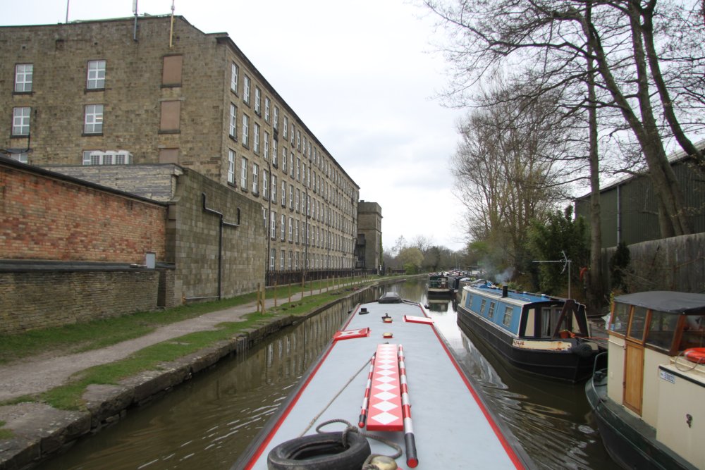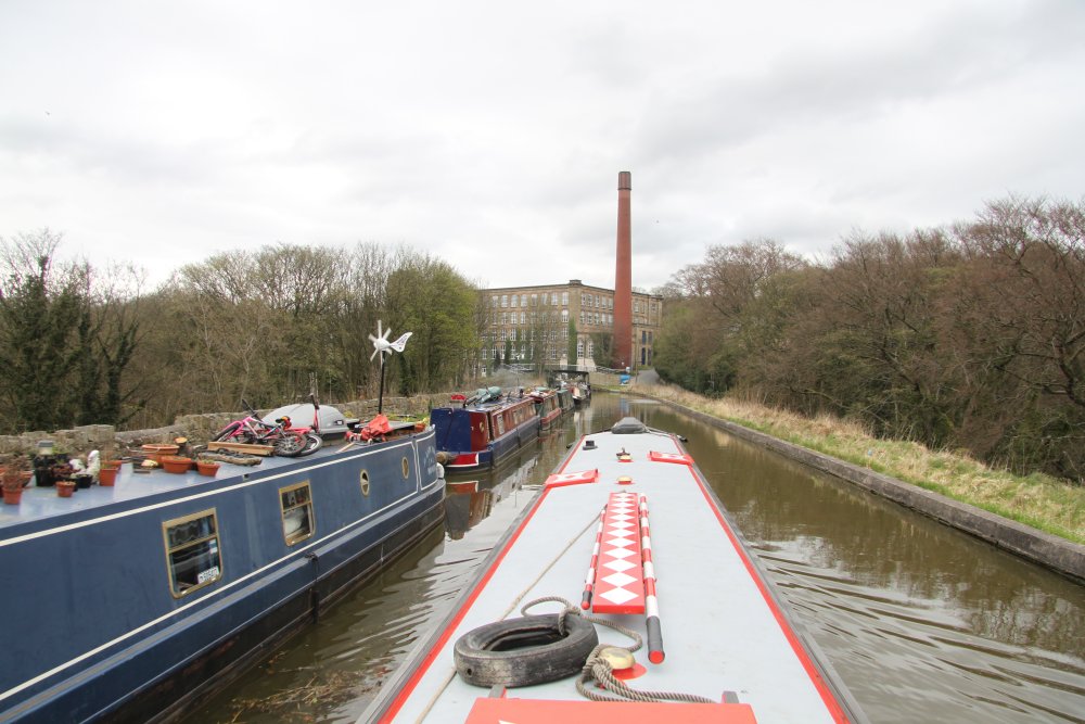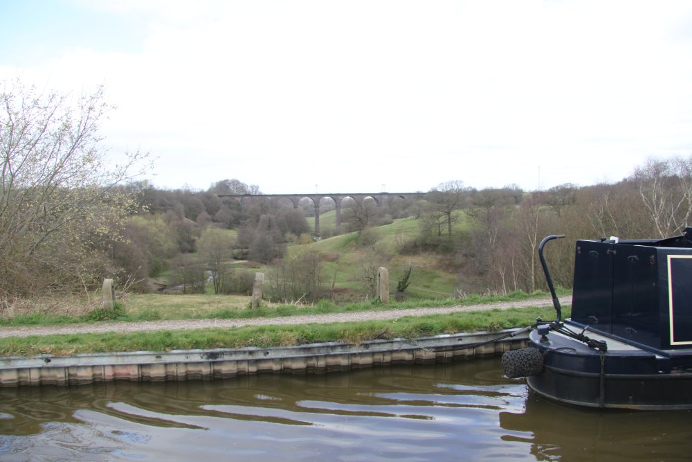 Bollington Aqueduct, visitor moorings and Clarence Mill.