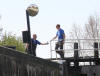 Holme Lock. CaRT bods adjust sluice ram with club hammer.