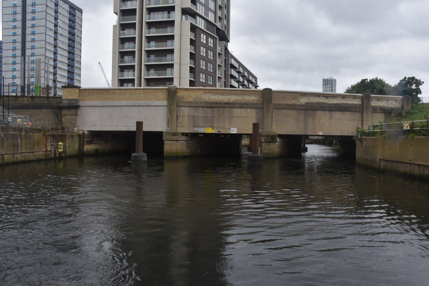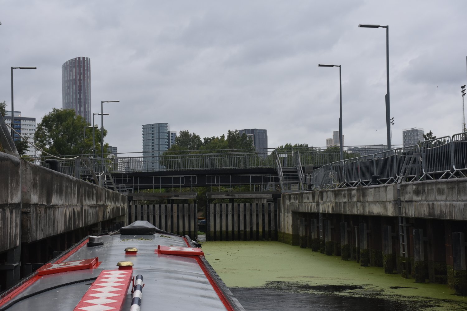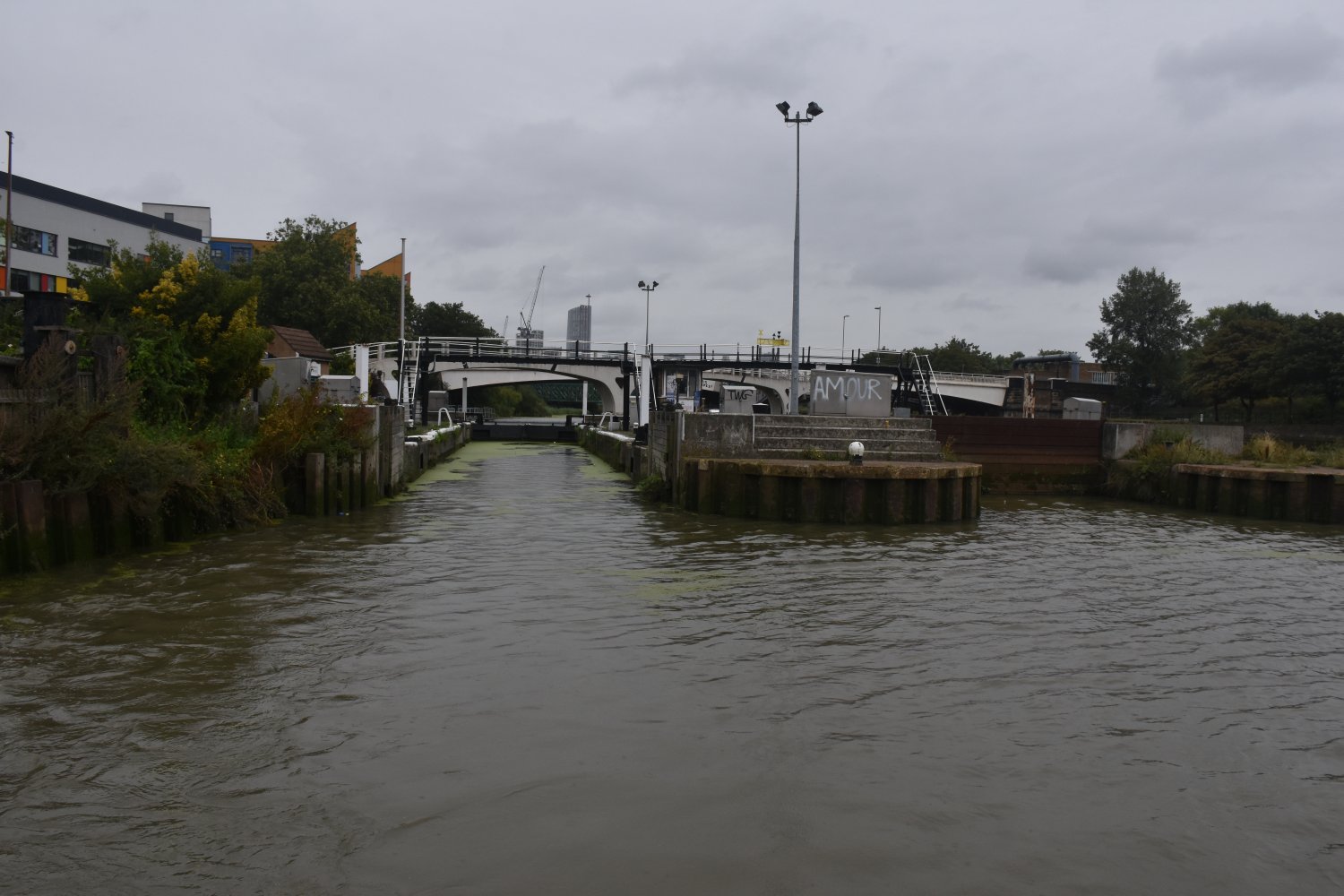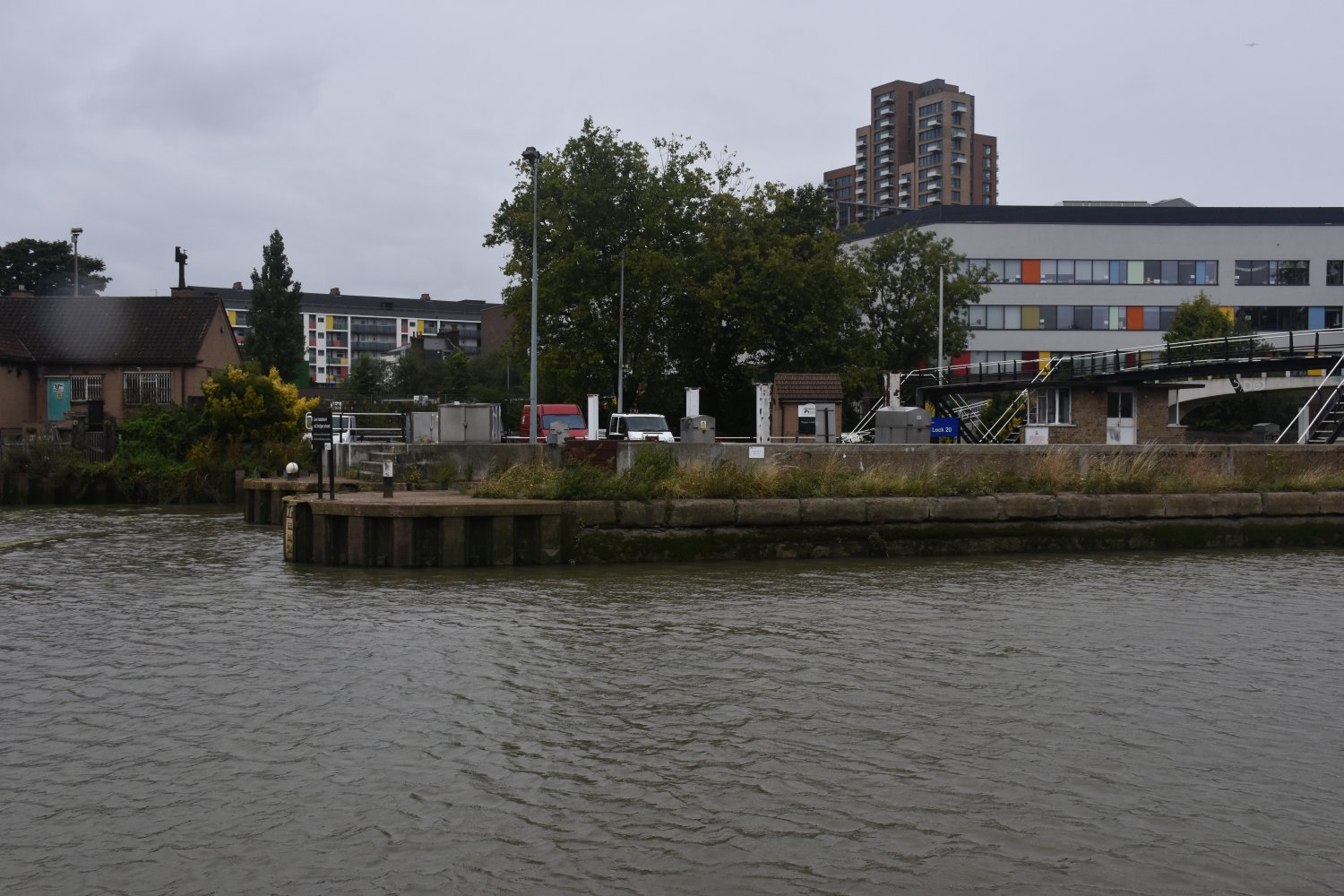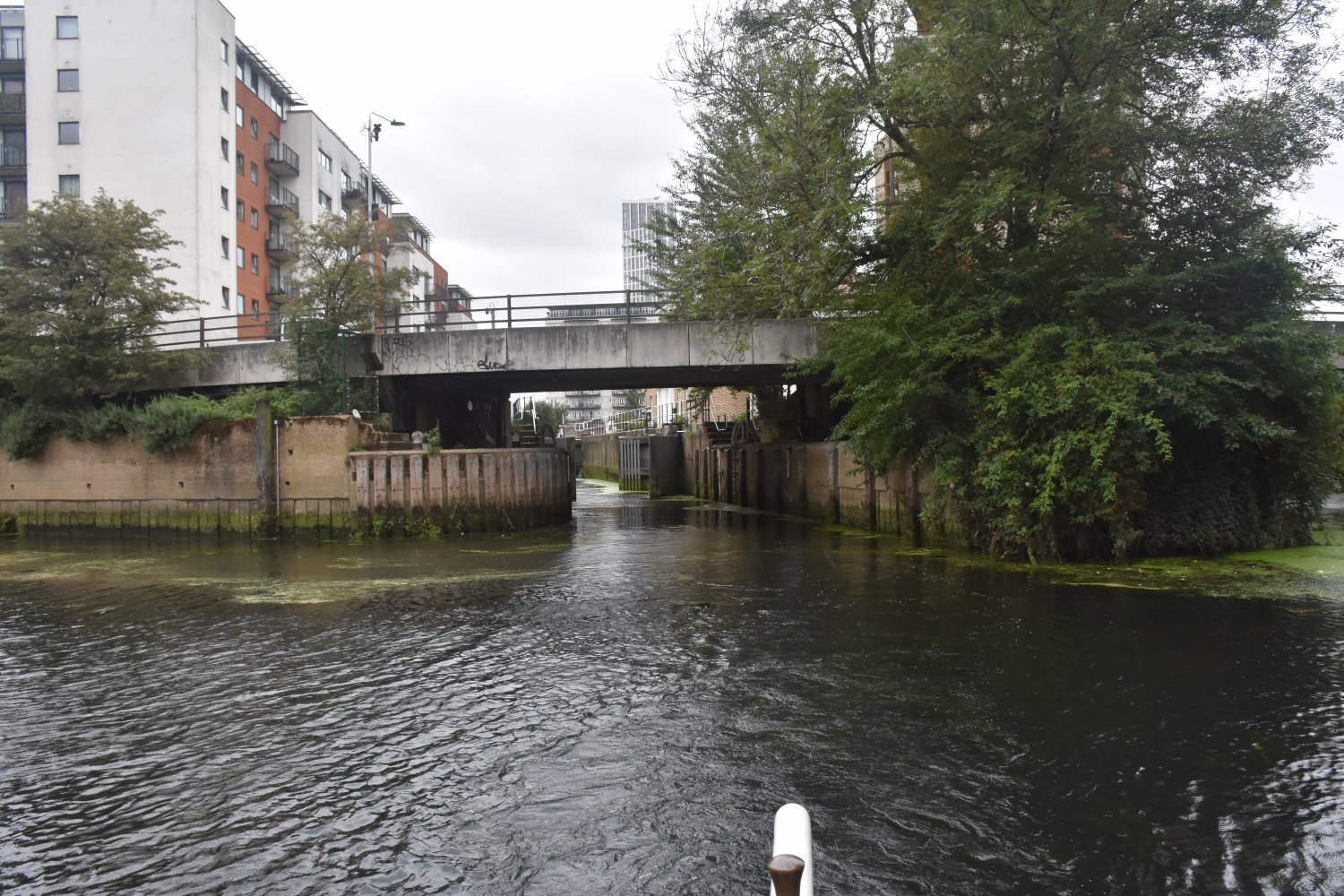 Exiting Bow Lock onto the tidal Bow Creek. Note the recent addition of outer