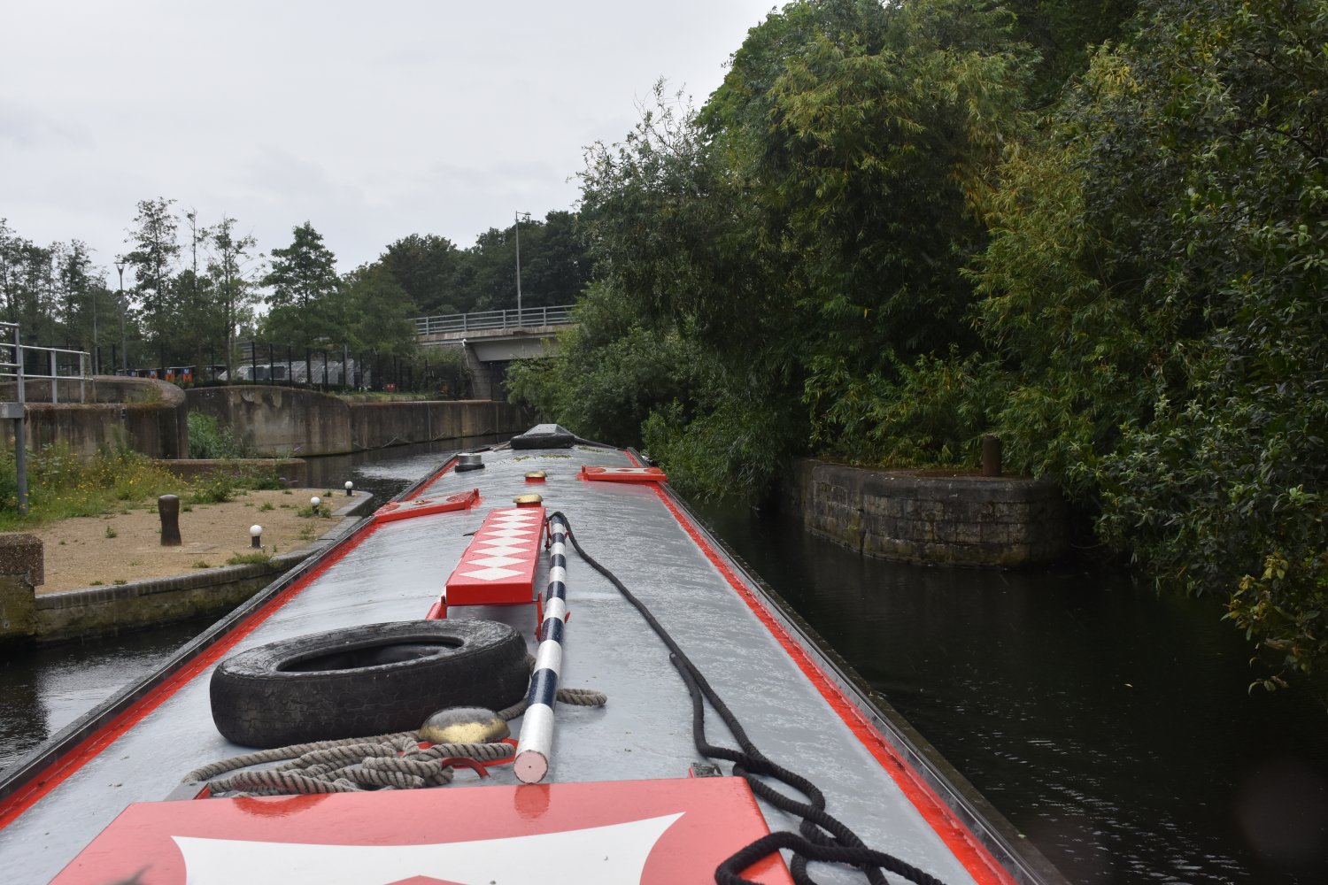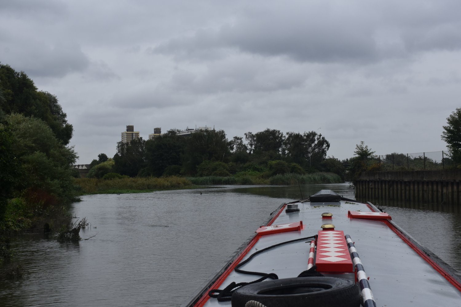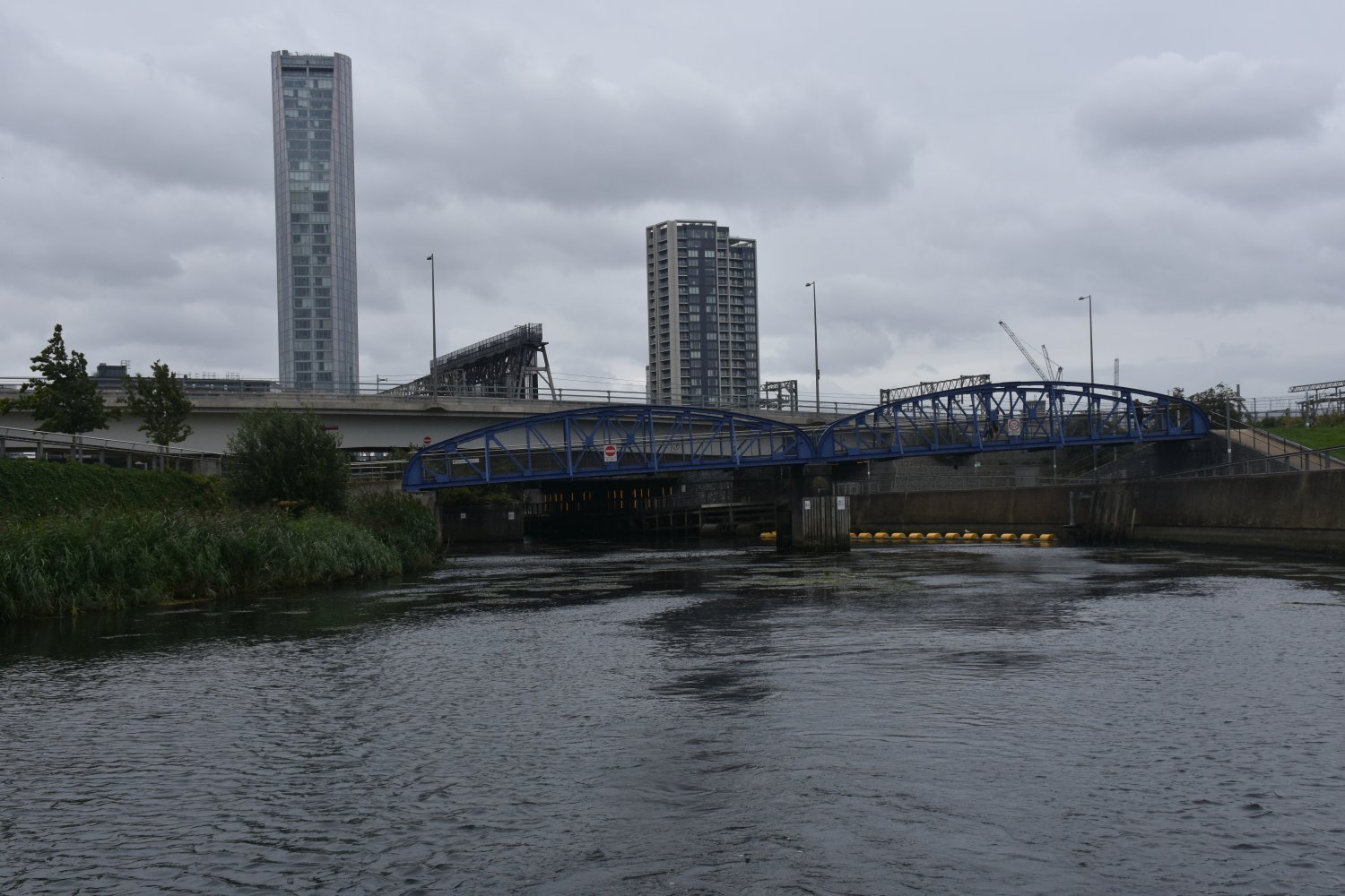 River Lee Navigation. Looking back at Old Ford Locks and the entrance to the Bow