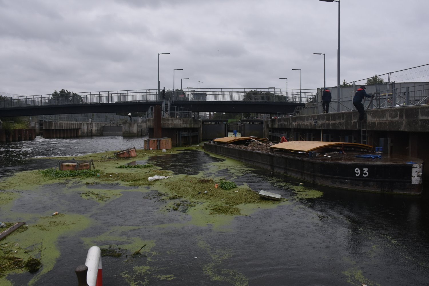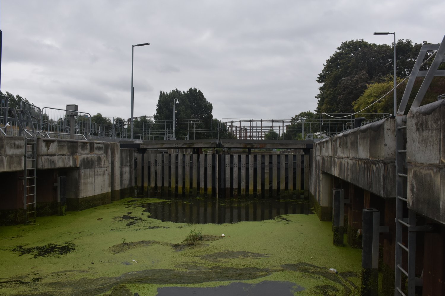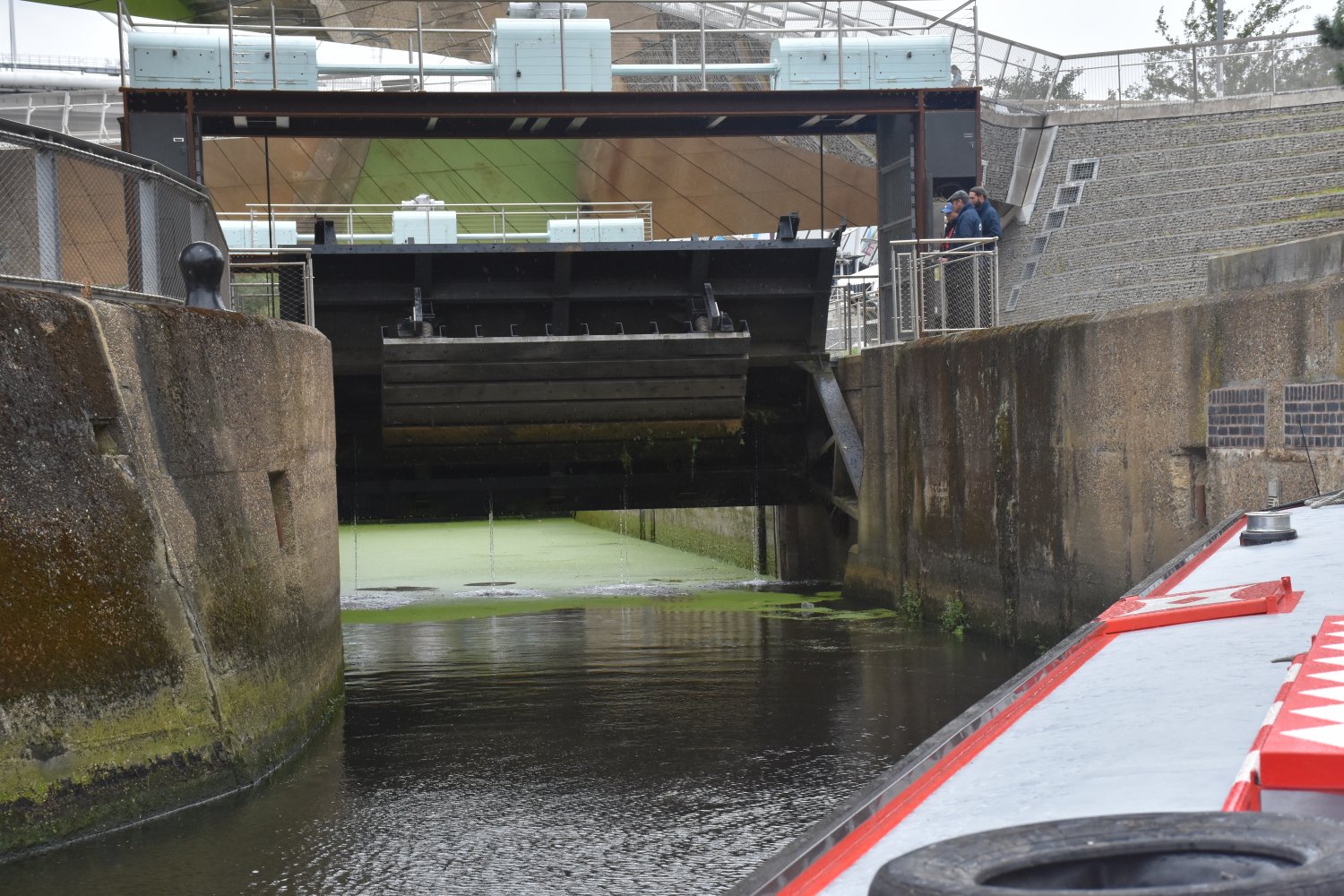 variable tidal weirs / gates. The CaRT lads have moved the weed barge to one