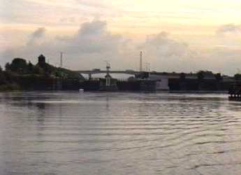 Moore Lane Swing Bridge at 11.30. The Runcorn Bridge over the Mersey dominates