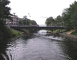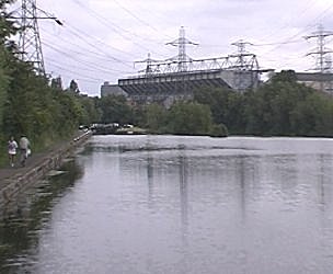 ![]() Freeman's Meadow Lock, Leicester. Large unprotected weir to right. West stand Leicester Football club above trees. |