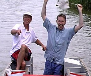 Monday 6th July saw us leave Cranfleet Cut fairly late at 9.35am. We had a fairly fast trip down the River Trent, but were held up a bit by a slow moving craft on the Beeston Cut, arriving at midday. We then did a spot of shopping in Sainsbury's then went for lunch and a pint at "The trip to Jerusalem" in the Castle mound. We left at 2.45 pm with the object of getting to Newark that night. As we turned the sharp Poplar Arms Corner heading back down to the River we were aware of some lads up on the bridge. The canal is in a bit of a cutting here with no access up to the bridges. We had just passed the bridge when we were showered with gravel, a bit of an opportunist attack. Ian was a bit incensed so ordered the boat into the bank. He legged it back up the towpath and jumped up to the bridge using a handy pipe. The lads were a bit late in scattering and Ian after a bit of a run caught one of them! Ian who is really a bit of a pacifist bid not wallop the kid, but instead gave him a civic dignity lecture! We were soon back under way, but Ian had knackered a muscle in is flight. At 4.00pm we swung out of Meadow Lane Lock back on to the River Trent and had a fairly fast run all the way to Cromwell Lock, arriving there at 10.05pm. We obviously intended to stop in Newark, only one decent mooring was noted not far from the bridge so we decided to go down stream of the bridge, wind and then come back to the quay. This was aborted due to being spat upon going under the bridge, Newark did obviously not want our trade!, at least it would be nice and peaceful at Cromwell. We had dinner on the move as soon as we were through Nether Newark lock. It was indeed a nice quiet hot evening at Cromwell Lock and we started to drink into the beer locker.