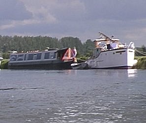 In the morning of Monday 16th August Neil got the outboard and Quicksilver inflatable out of "Earnest's" engine compartment. The old vacuum cleaner kept on "Earnest", which can blow as well as suck, soon blew up the tender. Peter and Ian's children, Nancy and John were soon practising going up and down through Osney Bridge. Ian was upset that the river level now seemed about 3 inches above the normal level. Neil assisted Ian with removing bits from "Straight Across". The spot light and VHF aerial were removed from the canopy roof. The heavy mast had to be taken out of it's bottom bracket and laid on the cabin roof. Ian then moved a lot of forward ballast into the engine compartment. The bilges were then flooded and the six plastic dustbins Ian had taken with him (two were his cleaned out one's from home!), were stood on the stern and filled up with water. We all climbed aboard and Ian requisitioned one other boater to act as ballast. We pulled off and then gingerly crept under the centre of the curved girders of Osney Bridge. Neil recons there was about three inches spare dead centre, so no room for much of an error! Neil and Peter were dropped off to walk back and get "Earnest" and we both set off at 12.10pm. We stopped above Kings Lock on the North bank, just up stream from the backwater to Duke's Cut. It was warm but blowing up for a storm, Neil, Ian and the kids went for a swim and then the kids played around in Ian's two canoes and his little tender "River Tramp". We were intending to go straight back on the River Thames, so Ian, Neil and the kids decided to "do" Duke's Cut. We went up Duke's Cut, through the lock and turned and then came back again. Ian was impressed that a B.W. workman tidying up the lock surrounds brickwork acted as a lock keeper, "Just like being on the Thames!" he said. We started off again as it started to rain at 4.10pm, with the destination of the visitor moorings just above Pinkhill Lock. Neil departed company above Eynsham Lock to get some very expensive diesel at Oxford Cruisers which involved reversing back up a narrow inlet to an awkwardly sited pump. Neil eventually stopped as planned at 6.00pm and met up with Ian.