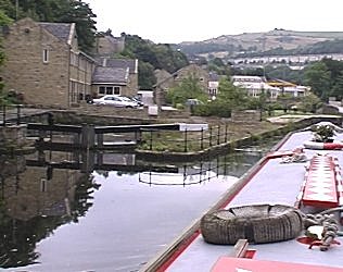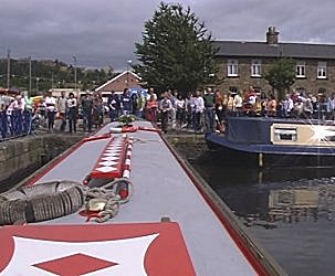 Sunday 18th July saw us start off in the direction of Leeds at 8.00am with no particular stop for that night planned. We reached Salterhebble Top Lock at 8.45am and decided to go straight on and do the Salterhebble Branch, the stub that is left of the Halifax Arm. There was room to wind right at the end and we reversed right up to the point where the canal used to continue on to Halifax. We were back at the top lock at 9.00am and continued down the Salterhebble Locks, having no trouble length ways getting out out the locks. We stopped at the bottom for ½ hour to have breakfast. Cooper Bridge was passed at 12.55pm an we got to the bottom of the two Thornhill Locks at 3.05pm. Here we did the sharp turn and under the tiny bridge to go up the Dewsbury Arm. As we reached the end there seemed to rather a lot of boats, many decked out with bunting and balloons, apparently we had arrived on the Dewsbury Basin Gala day! As we reached the final turn in the basin which is the winding point we realised that we could not wind as the trip boat was in the way. At this juncture Neil thought sod it and took the helm from Julian, we were going right to the end! Apparently the end was a procession of boats and we had become one of them. The commodore of the cruising club starting ranting with the veins sticking out in his neck. "You can't come up here!","Your too long!". Neil assured him that the fact that we were here meant that we weren't too long, we had a valid license, we had come up specially from London to do un-cruised sections and we were going to the end! We heard our un-official arrival announced on the Tannoy! We touched the bow fender on the end and then with Julian on the bow thruster (Neil never needed it) we shot back to the corner, winded at the corner (the trip boat had just left) with out touching the bank or any other craft. We then started to leave with arousing cheer from some of the boat owners. One bloke beckoned us to moor up beside him, but Neil declined saying we were just some of those miserable Southern been there, seen it, done it types. The large trip boat let us pass as he wanted to wind at the junction. He gave us a broad grin. This detour had only taken 20 minutes. At the next lock down, Mill Bank, a cruiser was just entering and he beckoned us in. This chap was at the Rally and had seen it all. He said the Commodore is a right old Mr Hitler and we had put him in his place, our exploits will be laughed about for months to come! This made Julian feel better as he was a bit apprehensive about our gate crashing. We had decided to stop for the night at our favourite pub in the area, "The Navigation" at Broad cut and we got there at 5.30pm. We locked down with the cruiser but he moored just below Broad Cut Top Lock. He said that this was because the smell from the nearby sewage works was not so bad there. The only spot was right outside the pub. It was a hot evening and the sewage smell was certainly bad, we have never noticed it before! Julian asked the landlord if he would mind us taking his glasses on the boat, he replied that he did not, as he was more likely to get these back. Apparently those used by the youngsters normally ended up in the canal! Julian had a celebratory meal to prepare, so we stayed on the boat all evening, drinking the very powerful Elland Brewery Nettlethrasher. The occasion was the 30th anniversary of Neil's first canal holiday. Neil had made up a CD compilation of all the hits around at this time and horrified Colin by crooning along with Glenn Campbell! This singing (and the amount of Nettlethrasher he had consumed) disagreed with Neil and he was rather poorly afterwards!