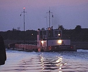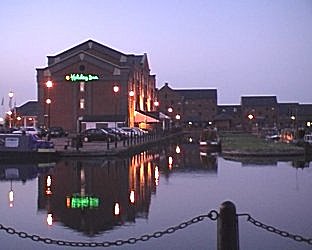 Thursday 29thJuly saw us leaving at 8.25am, we got to Chester at 1.00pm and spent an hour shopping and having lunch. The amount of traffic held us up at the top of Northgate Staircase for 20 mins, we eventually came out the bottom at 3.05pm. The lock-yourself-in haven of the Boat Museum was reached at 5.45pm after being pelted with stones at Weavers Bridge 142. Upon passing the yobs hid behind the parapets. This may have been a mistake because Neil was ready for them and threw a couple of 1664 bottles ½ full of water (for a bit more momentum and to guarantee they smash!) up in the air, smashing on the bridge deck. It is all very well throwing things back at yobs, but you want something that smashes and they cannot throw back at you! We never knew if we hid them or the got showered with shrapnel, they certainly did not appear while still in sight. There is a gate on the towpath just before the locks down to the lower basin in the Ellesmere Port Boat Museum. At night this is shut and you can get out using your B.W. key. Since the Holiday Inn was finished and since our passage on the Ship Canal in 1995 the swing bridge into the Lower Basin and hence the Ship Canal has been "restored". This is now fitted with a non B.W. keyed padlock, to open it you have to phone up Neston and Ellesmere Port Borough Council. Yet more ridiculous "red tape" to stop people using the Ship Canal. By 5.55pm we had passed through the two narrow locks and moored on the islands opposite the new Holiday Inn. The only 60ft mooring left had no rings, so Neil had to hammer thin pins into cracks between cobbles. That evening we had a wander around the site and went to the "The Waterfront" a new Italian Restaurant on the old outer wharf overlooking the Ship Canal with Stanlow Oil Refinery shimmering in the back ground, surely "The Costa de Ellesmere Port"! The meal was OK, but a bit expensive. It was a hot evening, all the doors were open out to the terrace, the high octane of Stanlow could easily be smelt! Afterwards we sat on the terrace watching quite a few craft moving on the Ship Canal, it must have been high tide at Eastham!