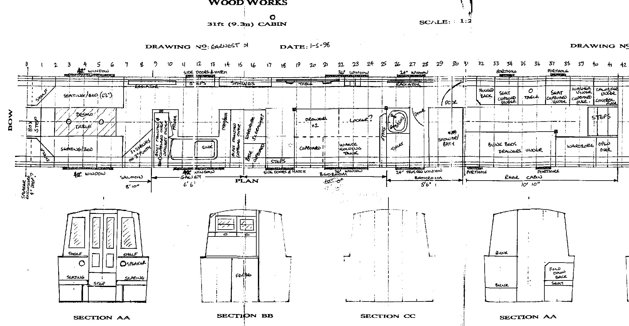Andrew's final quote fit out plan, altered in construction : R/H port holes made level with L/H, drawers below upper peninsular cupboards not fitted, drawer added above fridge, 42" window reduced to 36", two hardwood posts used to support upper peninsular cupboards and all interior controls put in L/H back corner in side of junk cupboard below cubby hole.