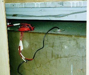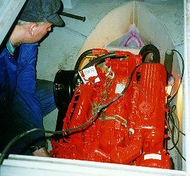 Near the end of Andrew's fitting Keith started fitting the engine, two of the alternators had to be removed to fit it between the rear deck scupper bars. Neil, Ray and Keith discussed where the multitude of engine compartment mounted bits were going to go and you guessed it, they all ended up on the left hand side! This was to leave the large space left in the right as storage for the Porto-power hydraulic ram kit, collapsible sack barrow, inflatable boat, outboard motor and Mountain bike, yes they do all fit in there! The views in "Earnest" In Detail page show the neat finished job. The addition of the bow thruster led to another discussion between Neil, Sheila and Ray. R&D's preferred range of electrical bow thrusters are those supplied by Aquafax. The main reason that Neil finally opted for one was more for re-sale value, virtually every boat Neil saw being built of this length had one. Ray suggested just putting in the locker and tube, but as Neil opted for just a 4hp one, R&D's price was so reasonable that he went the whole hog. For this length of boat Aquafax recommended the minimum of a 6hp model, but they had not yet bought this model out! The next size up was 9hp, Neil thought this was rather excessive especially as he thought HE would never need it. The 4hp model only needed one extra120A battery, but as Aquafax would not warrant a 4hp model it has been given the extra protection of a thermal cut out. In fact there is less need of a bow thruster than "Beatty", "Earnest" as it has more presence in the water seems to behave better, even when going astern. With the extra battery to charge a re-think in the charging department was needed. With some help from the very helpful Charles Sterling of Sterling Marine Power the following set-up evolved :- Standard 12v 70A alternator charging single bow thruster 120A battery (in bow cockpit locker) through already fitted (though now not needed, only cables of the charge current, 90A are now needed) 300Awelding cables, using Sterling Advanced Alternator controller sensing charge voltage at the remote battery to ensure full charge. The extra 90A 12v alternator charging one start 90A battery and four 120A house batteries through 100A splitter diode and second Sterling Advanced Controller (the alternator needed an exciter relay enabling it to "see" the 12v of the battery, activated by start position of ignition switch). The heavy duty cables going to the bow thruster battery can now be made useful in an emergency to share the current with the house batteries by means of an extra isolator switch. Each individual battery bank has its own isolator switch. Neil connected the power amp (50W RMS per channel!) section of his stereo to the bow thruster battery to share charge drain when the boat is not under way, also this eliminates the unstoppable interference that the fridge inflicted on the stereo. Neil also modified the 12v distribution board so that all three bilge pumps and the boiler (so it can be set on the frost stat) are now not isolated. Another late fitment was the Sterling 60A 240v battery charger / 1500W inverter so that the boat can be kept charged up from a shoreline socket when laid up, or power things up to vacuum cleaners and large power tools when the boat is laid up. Originally the three sources of 240v AC were switched by the failsafe method of plugs and sockets. Neil has now made up his own switch box up using 12v coil 20A 240v double pole relays thus the three sources of 240v AC can now be switched by a simple rotary switch. This also enables the charger to be switched on from the shoreline socket or from the Electrolux Travelpower 240v AC engine driven alternator. The last combination only being needed in the unlikely event that both of the 12v alternators had failed! Other electrical novelties include a 12v computer type fan in the shower mushroom vent along with a recently fitted extra spot lamp, switched by the fan switch.
