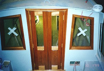 ![]() Hardwood front doors and windows fitted, note front vent in bulkhead NOT in doors. |