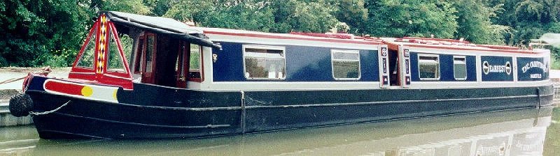 The Mikuni diesel fired boiler was found to be reliable and cheap to operate, the diesel it used being un-noticeable. There was however one very annoying problem - the loud ticking noise all the time it was operating. The noise from the burner, air and water pumps was virtually un noticeable from inside the boat and not particularly noisy outside (which is more than can be said for Eberspacers, which are sold without the standard fitment of an exhaust silencer). The ticking was traced to the fuel pump solenoid. The whole Mikuni assembly is mounted on rubber insulators and the fuel flow solenoid mounted on yet another rubber insulator, mounted onto the main chassis. The manufacturers are obviously concerned about the noise this component makes - why then connect this up the the bulkhead mounted fitting with a SOLID COPPER PIPE for the sound to be carried through! This pipe has now been insulated with a specially made up, very short iso what ever it is rubber pipe. The ticking noise is now barely discernable, even when you are actually in the engine compartment. This is a modification suggested to all Mikuni owners, god knows how noisy the metering pump would sound inside a Trad, when the boiler is in with you! December 1999 did see a problem with the Mikuni. Air was getting in at the final union to the burner head. This caused a suicidal build up of carbon and a complete de-coke along with a gasket and seal set has been necessary. The flue outlet has also been extended upwards to exit on the angled side of the hull, above the upper rubbing strake. This was necessary due to the over ballasting Dudley Tunnel traverse of July 2000. Another benefit of this is that the outlet can now not be blocked or restricted, by going up against piling. Another good point about "Earnest", is how quiet it is. Inside the cabin while going along all is virtually silent without any engine rev dependant vibrations that were present on "Beatty", which we always thought was a fairly quiet boat. This is obviously a testament to the structure of R&D's steelwork, Andrews solid fitting and the very flexible Beta engine mounts, Centraflex drive coupling and the acoustic treatment of the engine compartment and engine covers. "Earnest" is also very quiet while steering, though not TOO quiet, Neil likes to be able to just hear what the engine is doing so that you can hear whether there are any problems or something on the prop. This is especially as Semi-Trads tend to be the noisiest style, as the engine noise is "funnelled" in the rear cockpit with you.