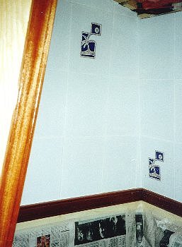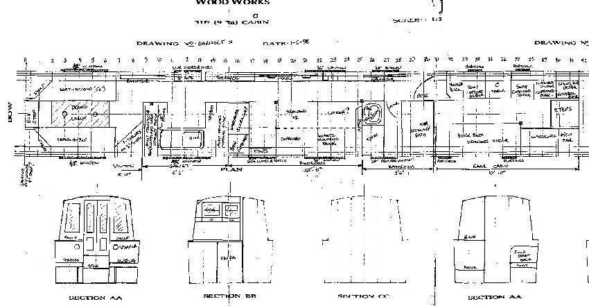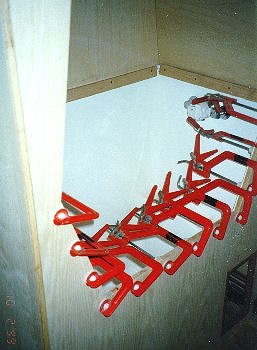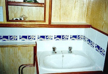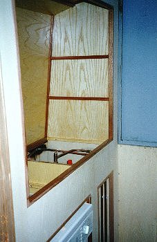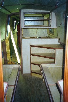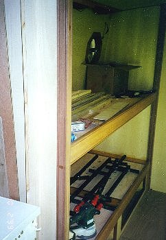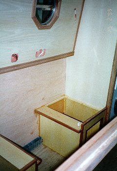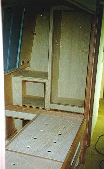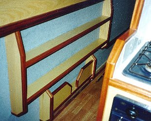 In the Galley Andrew made a slight deviation from our original plan, by keeping the work surface 2" higher than normal and not putting the fridge on a plinth we managed to get a much more suitable cutlery drawer just under the work surface, above the fridge. This dispensed with the awkward little drawers below the upper peninsular glass fronted cupboards. Andrew uses a particularly strong cabinet makers way of constructing the carcasing. Not that many screws are used (the heads of which are difficult to hide), but instead "biscuit" jointing tongues are fitted into machined slots and the whole lot stuck together with a particularly strong glue, being clamped while setting. Every bit of construction Neil can get a grip or sit on will take his 11 stone weight! When all the carcasing was finished and every thing was measured up it was apparent that Andrew had adhered to our measurements exactly, there was an extra inch in the rear junk cupboard and an extra inch in the Saloon large shelves. as can be seen from the accompanying photographs all the cupboards are lined and the lower cupboards mounted on plinths, where these plinths cover pipe work there are removable panels. All heating and water pipes are covered with neat easily removable wooden covers.