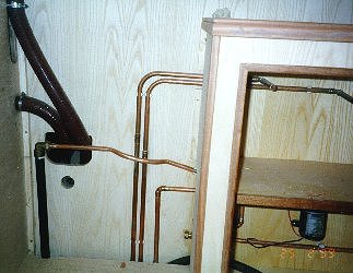 When Ray was welding all the waste outlets through the hull side Neil discussed the proposal of flushing the toilet with canal water, Ray said the best way was to not fit a sea cock below the water level (for obvious safety reasons), but to weld a stand pipe on the inside of the hole to above water level, so that if the sea cock failed, the boat would not sink. Ray was a bit sceptical about the Jabsco DS 14 electric flush toilet. It was all plumbed in with an extra raw water pump, protected by two filters and non return valves. Two cocks have to be turned to change over the supply. It has worked faultlessly all summer 1999, the filters being cleaned once, never being changed to fresh water flush! Ray is sill dubious and whenever he comes on the boat he can't help but give it a "check" flush to see if it still works, actually Neil thinks that he now secretly approves of it! As can be seen from the accompanying pictures the plumber was particularly neat and used domestic 15mm copper pipe. There is controversy about whether to fit this or the Acorn plastic type of pipe. "Beatty" had the plastic type and it took along time to get all the joints watertight (especially when joining up to copper connectors). Frost and the movement of the boat tended to make certain connectors come apart on "Beatty". Another fault was that it tended to shrink with age, so pipe work had to be laid slightly over size. Copper pipe is fairly hardy in light frosts and whenever "Earnest" is laid up for long winter periods we shall drain the hot tank and cold water system, as we always did on "Beatty". "Earnest's" cold water feed for the hot water tank has a drain cock on the bottom calorifier connector from this Neil has run a piece of rubber pipe into an old plastic tray in the stern cabin dry bilge. All you have do to drain the system is to move the dry bilge pump into this tray and drop the water!