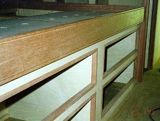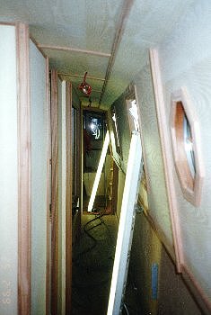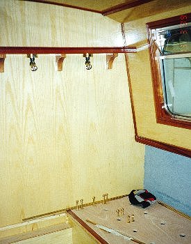 The next weeks trip showed that the fitting was well under way, the boat was ballasted (mostly on the right side, because almost everything is on the left!) and the floor down. Most of the battens were fixed to the steelwork to take the plywood lining panels. Next visit showed the boat insulated with rockwool, the main wiring runs done and most of the lining up. The hold up at the bow had been the water tank and the bow thruster locker bulkhead. The bottom of the bulkhead was in, but still had to have an angled top to it to clear the the slightly offset hatch. When Neil saw the water tank it was apparent that it could be a lot larger, Ray's daughter Sue (who makes all the tanks) then made one to fit exactly, Ray was convinced that the bow would be too heavy! Owing to the size of the tank the final floor stiffener was left out and welded in afterwards, Neil hopes that the tank never needs replacing! Andrew told Neil that the next few weeks would see apparent fast progress as the bulkheads and main carcasing was constructed, this was defiantly the case as it is always the finishing of that takes the time if something is well built. Neil gave Andrew a free hand in designing the simple fluting noted on virtually all the Saepele mouldings and posts, and many posts there were to, on nearly ever corner! Because of the tight dimensions Neil gave Andrew a few inches "recovery" length, this was in the large triangular shelves and in the large junk cupboard. For this reason Andrew started fitting in the Galley first, them moved on to the Master's cabin and Bathroom. The ends were finished last, this is a departure from Andrew's normal more methodical approach of starting at one end.