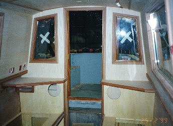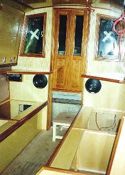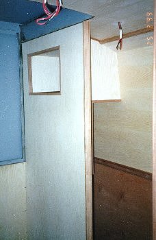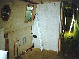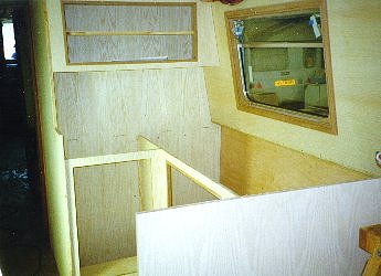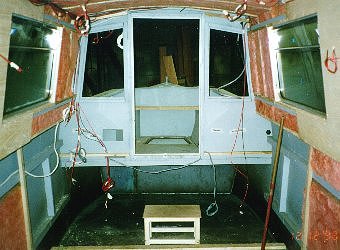 ![]() Door linings in, varnishing complete, lower sides carpeted, interior controls (white Mikuni thermostat / programmer now moved to Master's cabin bed head. |