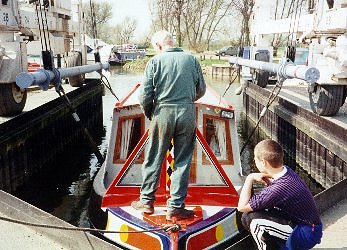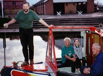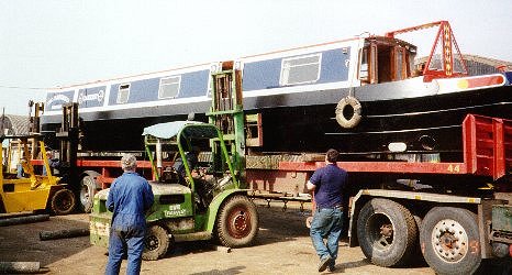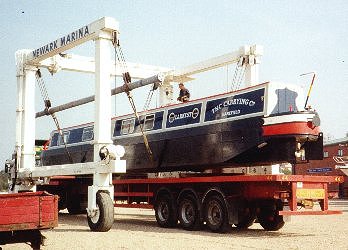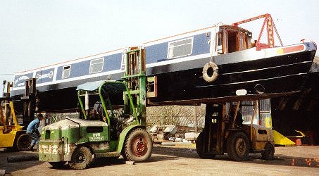"Earnest" was launched on April fools day 1999, exactly on schedule. R&D's preferred launch spot is Newark Marina , where the River Devon forms part of the navigable route through Newark, missing the River Trent. Neil thought it was handy for any trailing faults to be put right, and it gave us the Easter two weeks to get "Earnest" to Braunston where it would stay until being R&D's showboat at May 1999 Braunston Boat Show. "Earnest" would stay at Braunston until Friday 2nd July 1999, when Braunston would be used as a spring board for going North on the main 1999 holiday (see Tour 99 page "Earnest" Maiden Voyage ). Neil, Linda, Peter and Wendy went up a few days before in the Passat to help out with the final preparations, Linda dropped the car off at Braunston and was given a lift back. Neil slept on the boat, as there was one VERY late night, while Linda and children were put up by one of Sheila's bed and breakfast friends. As with most boats there was a bit of finishing off to do, which was done at Braunston. Two boats were going out that day, the other one was a wide beam barge (that we met at Willowtree Marina just South of Milton Keynes, on the Grand Union). For some reason this had been built in one of the wrong sheds and involved a serious temporary adjustment to the front door frame of the unit! Ray went off to launch the other boat early that morning, in the middle of the Grand Union Stoke Bruerne flight and met up with "Earnest" as it arrived at Newark. The lifting method is shown in the photographs below, using 5 folk lift trucks in a kind of synchronised fork lift ballet. The truck then just slips underneath. The boat left first after having been quickly loaded with all Neil's junk that he had brought up. We quickly caught it up in Andrew's van, Neil has a lot of video of it sedately cruising along at 45 mph. Ray's choice of Newark Marina is easily explained by the splendid 45ton self powered boat lift they have. It was soon in the water and Ray coaxed it into life. Ray moored it up onto a wide beam narrowboat that he knew the owner of, this was just by the road bridge where the River Devon comes out, opposite the rowing club. Ray soon departed to leave us for our first trail, as he and Sheila were coming back later for the "official" launch and naming ceremony. Ray and Sheila came back in the evening and we had the traditional T.N.C. launch ceremony of drinking the champagne and pouring some lager over the bow. It's first movements the next day was up the Newark dyke alongside the weir and up the River Trent a bit to give it the first taste of some current to battle against. All went well, Neil finding that for a quick turn it was best not to use all of the rudder (Ray subsequently told Neil that he should have mentioned this , apparently it is a result of the slipper stern. We went downstream to Newark Town lock as we wanted to fill up with diesel and water, which is downstream of the Marina Inlet. The next day we set off in a roundabout way to Braunston.