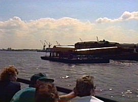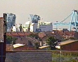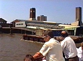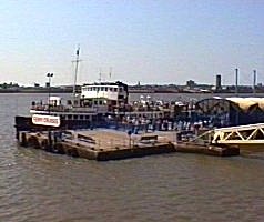 ![]() Just leaving Seacombe Ferry Terminal. The towers are vent shafts for the Mersey Tunnel. |