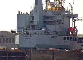 ![]() "Oakleaf" Royal Fleet Auxiliary craft undergoing repairs at Cammell Laird's. |