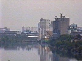 ![]() Looking up the Manchester Ship Canal from the Aqueduct. The green hulled ship is Arklow Villa, a bulk grain carrier at the Cerestar Wharf. |