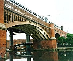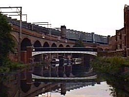 ![]() Approaching Castlefields, Manchester. Bridgewater Canal. The first railway bridge is in the Manchester Tram colours as it now forms part of the route to Altincham. |