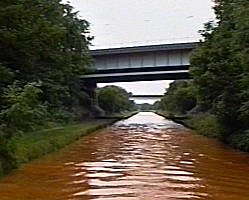 ![]() M 62 Motorway bridge just before Worsley, Bridge water Canal, Leigh Branch. Start of tell tale orange water section. |