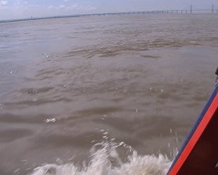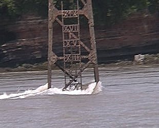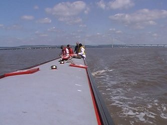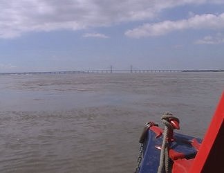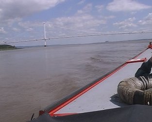 ![]() Coming up to the Severn Suspension Bridge and Hen and Chicken Rocks marker. Severn Estuary. (photo - Andrew Goodland.) |