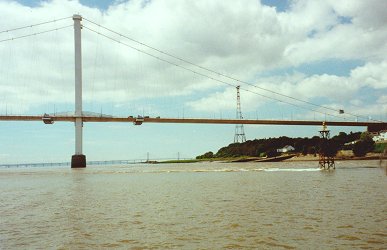 ![]() Looking back at the Beachley Point power cable mast and north pier of the Severn Suspension Bridge. Severn Estuary. |