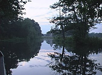 ![]() The still after the storm. Our mooring below Newark Lock. The back water beyond leads right up to Newark Priory. River Wey Navigation. |