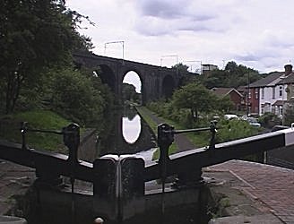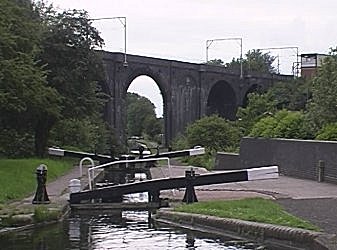 ![]() Looking up from Lock No 2. The railway here forms the throat of Wolverhampton Station. Wolverhampton 21 locks. BCN Main Line. |
