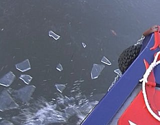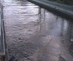 Wed 29th Dec we gave up and started early (7.30) back for home. As soon as the engine was on the Travelpower was switched on and we warned up with the 3KW fan heater that Neil had fortunately left on board. Ice was soon encountered by Kensal Green Cemetery, but we smashed on. It was about 1cm thick in places. The ice continued until Bulls Bridge. We got back to Harefield Marina at 13.30 and quickly packed up. On leaving, having emptied the water tank Neil noticed that the ice had completely removed ALL the bitumen from the bow and most way down the sides. Another bloody boating job for the new Millennium!
